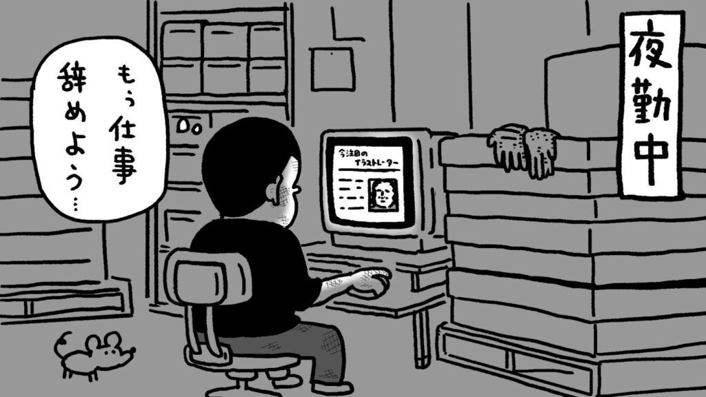 卒業後はしばらく印刷会社に勤めていました。絵から遠のきはじめていた頃、ある日専門学校の先輩が絵で爆売れしているのを知って焦りましたね。バクバクバクと、一瞬で動悸が激しくなりました。悔しさがこみ上げたと同時に「ぼくは絵を描きたいんだ!」と再認識したんです。