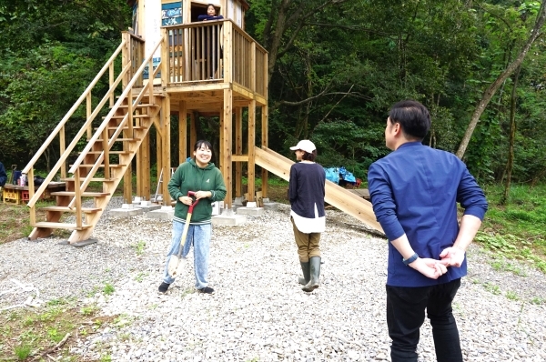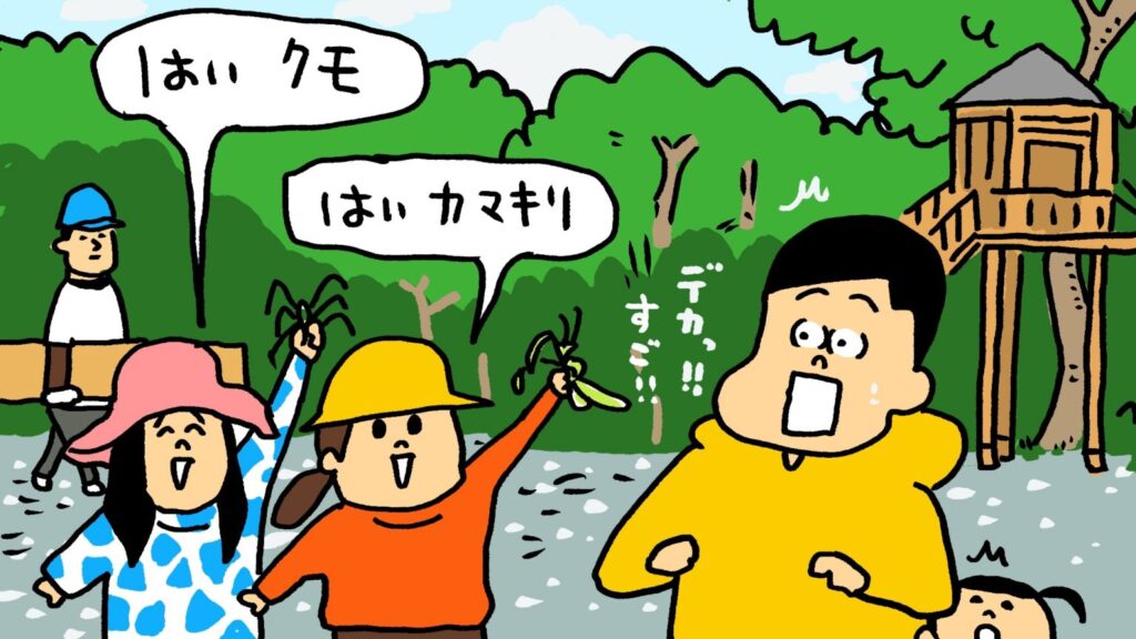 移住体験プログラムの途中に、青空自主保育『おひさまぼっこ』さんの活動を見学しました。親子でツリーハウスをDIYする姿をみて「この感じ、何かいいなあ!」とポケーと眺めていたら、でっかい虫を持った子どもたちが「これ見て!!」とぼくに見せてくれたんです。