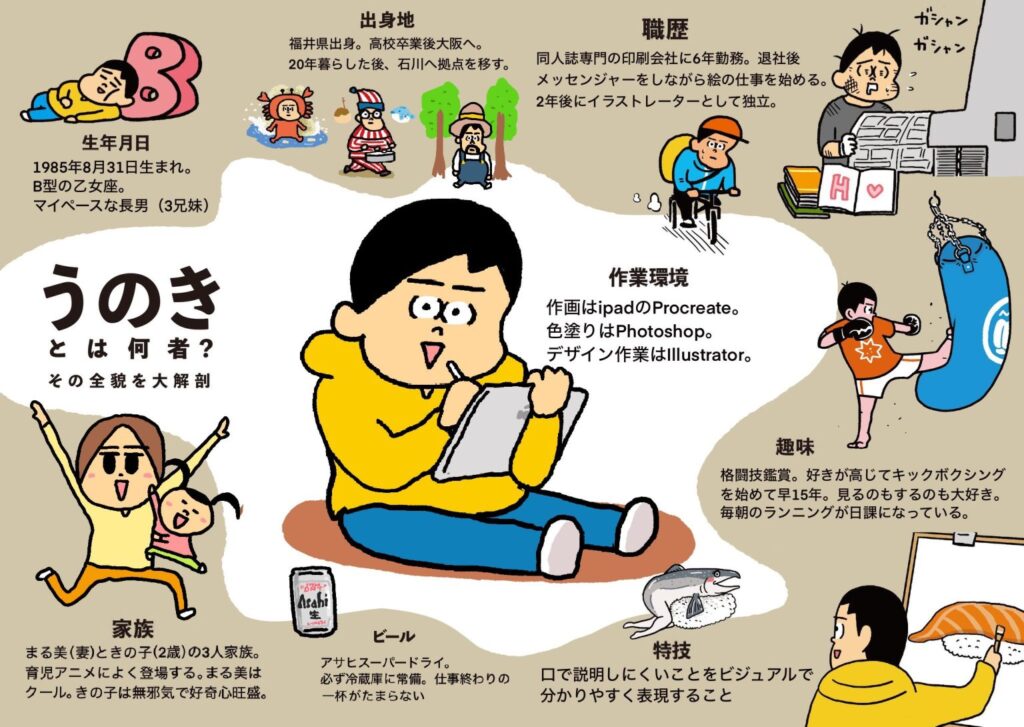 うのきさん:福井県で生まれ育ち、専門学校の進学を機に大阪に出ました。20年の大阪生活で紆余曲折あり、32歳の時に「イラストハウスうのき」として独立しています。