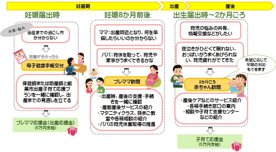 「プレママ応援金」は国の制度ですが、「子育て応援金」は能美市が制定した独自の支援です。妊娠期から出産、子育て期間まで切れ目ない支援体制が整っています。