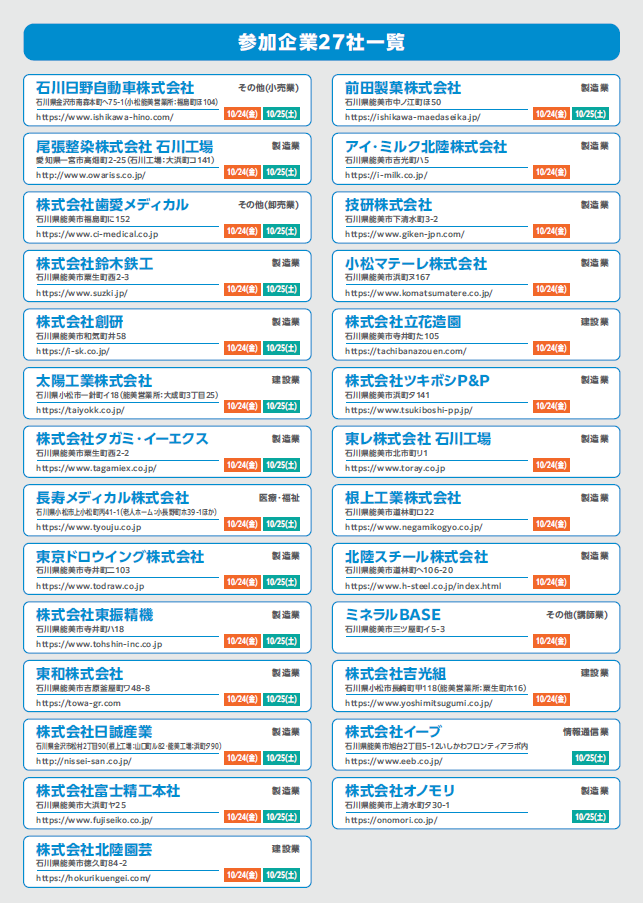 【10/24・25】能美市企業ガイダンス参加者募集 〜「能美で働く」をイメージする〜